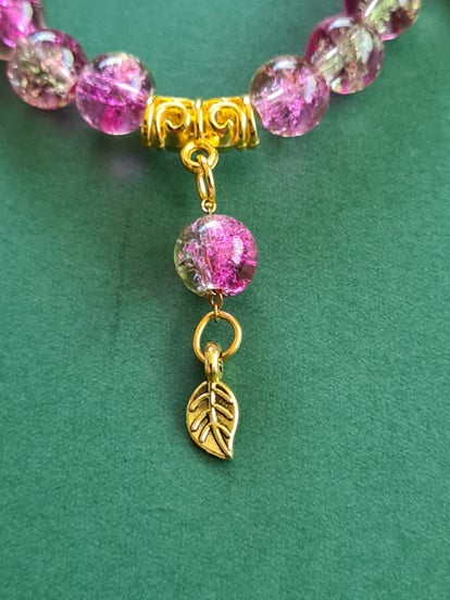 Mooi armband goudkleurig met goudkleurig bedeltjes in de vorm van blaadjes. Kralen zijn van glas met de kleuren van roze,licht geel