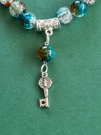 Zilverkleurig armband met sleutel bedeltjes eraan. Glazen kralen de kleuren zijn blauw,oranje en wit