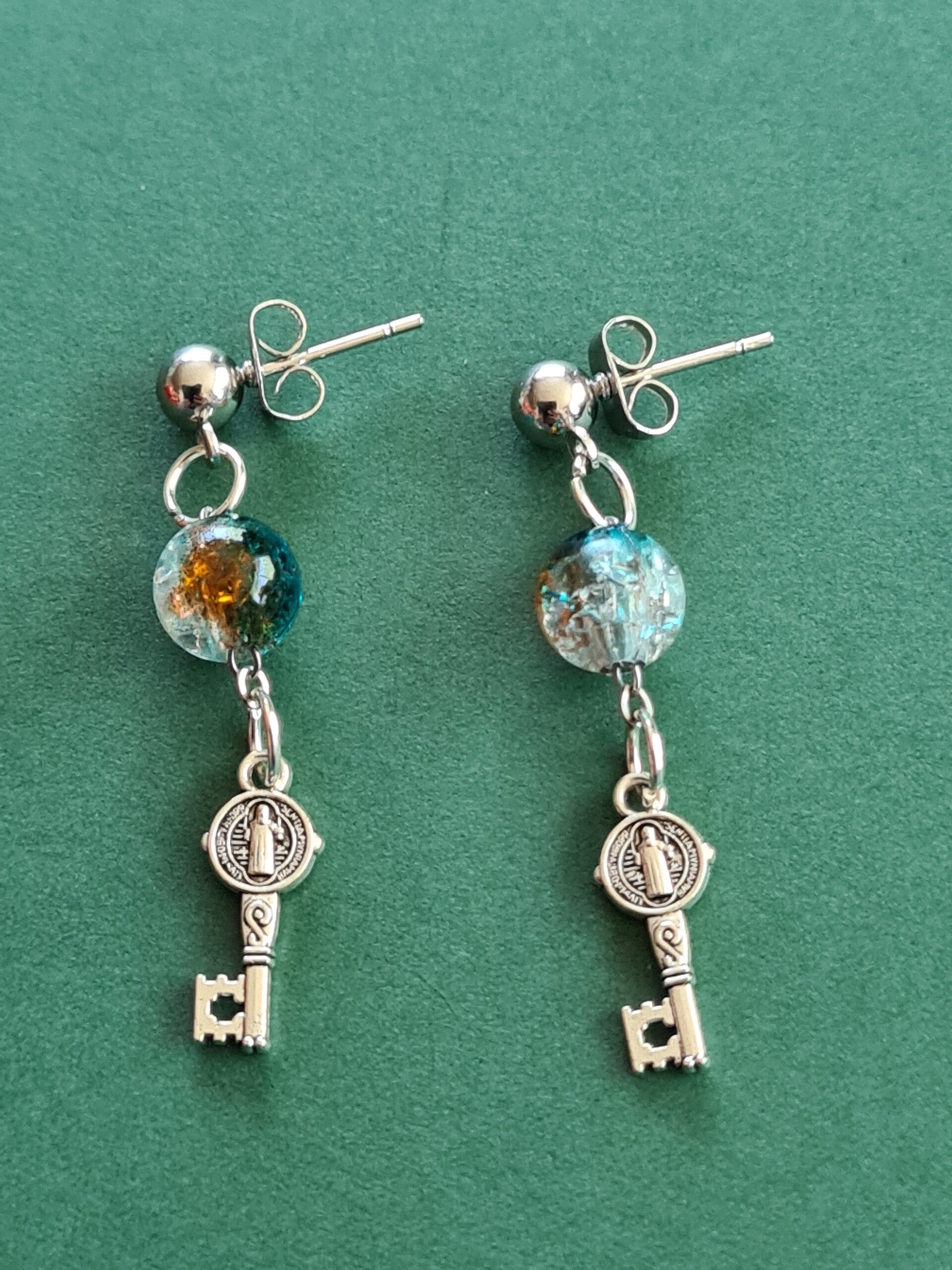 Zilverkleurig oorbellen met sleutel bedeltjes. Met glazen kralen in de kleuren blauw,oranje en wit